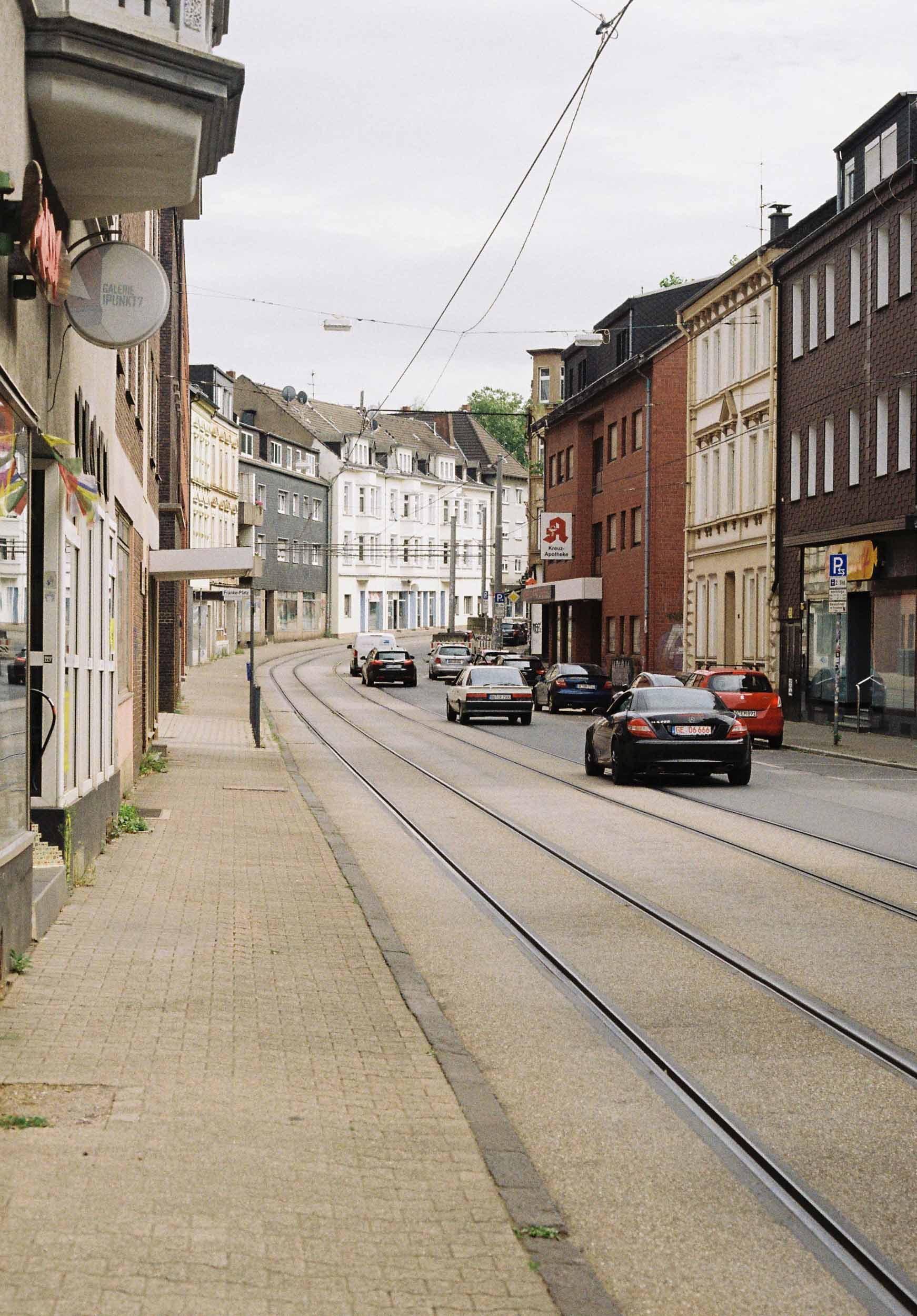 In Ückendorf angekommen, dauert es kaum fünf Minuten auf der Bochumer Straße, bis der erste Film fast voll ist. Alte Fassaden, Fliesenmuster und spannende Schaufenster reihen sich hier aneinander – mittendrin die Heilig Kreuz Kirche. Der heute als Konzerthalle genutzte Sakralbau ist ein tolles Beispiel für den Backstein Expressionismus im Ruhrgebiet und ein super Fotomotiv.