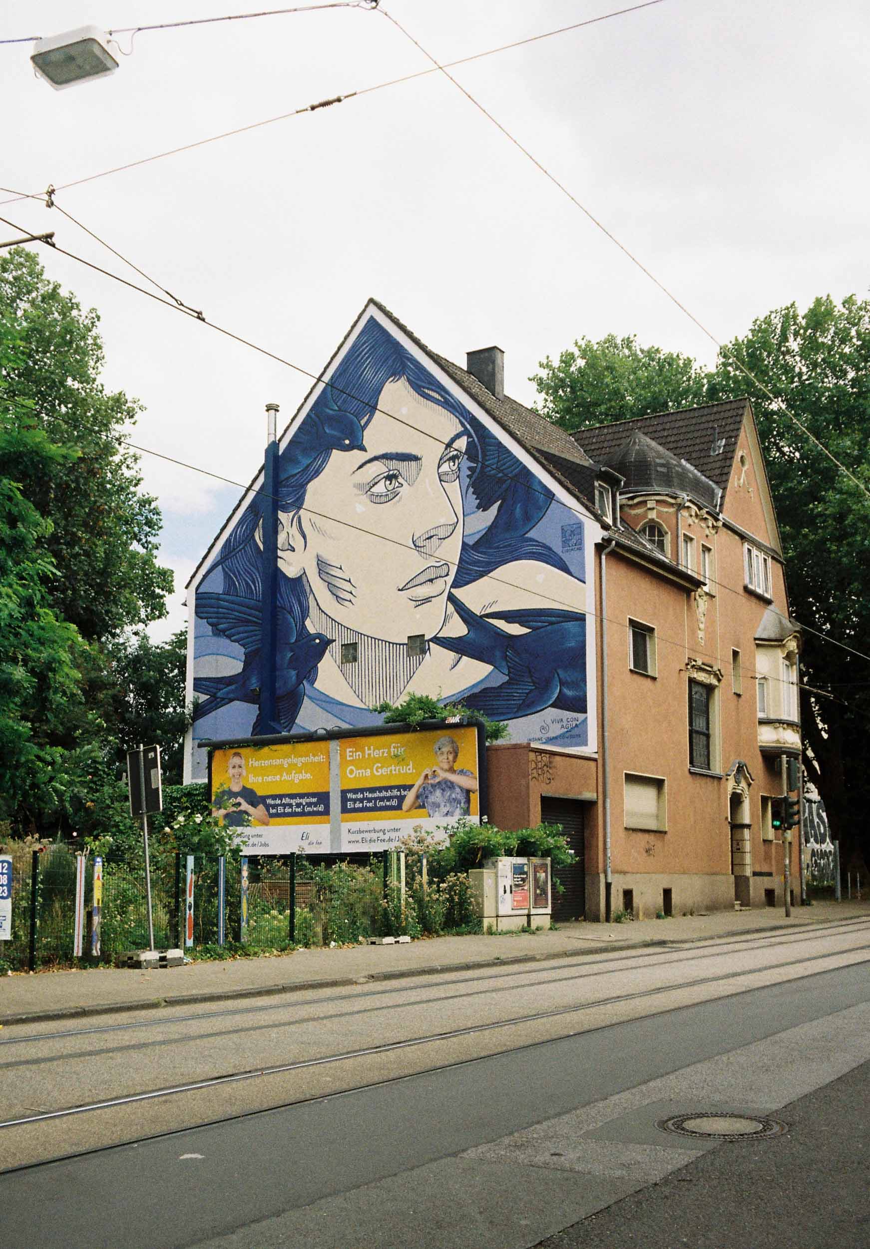 In Buer lohnt es sich in Seitenstraßen zu schlendern, denn hier verstecken sich ein paar tolle Street Art Werke an den Hauswänden. In der Maximilianstraße finde ich ein beeindruckendes Mural von MANDIOH, entstanden durch die Gelsenkirchener Street-Art-Offensive: eine Frau im Wasser, mit der Botschaft „Kein Femizid mehr“ – eine starkes Statement.