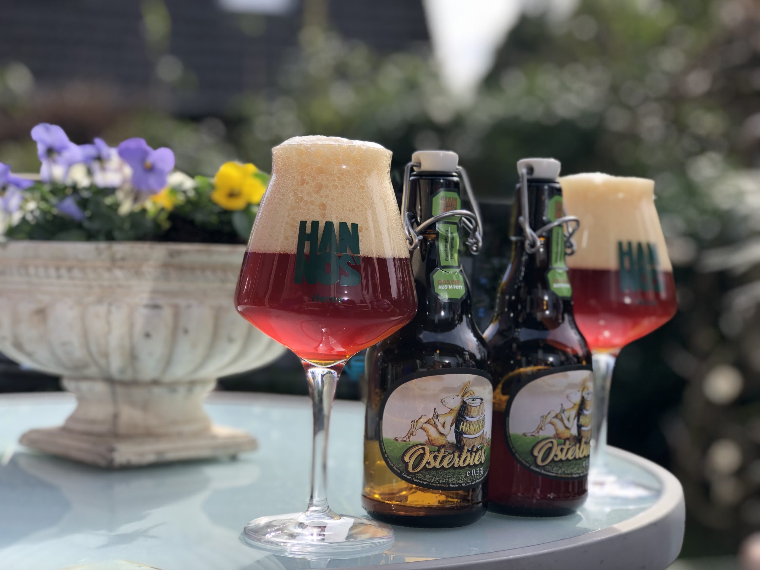 Gut, dass wir eine passende Grundlage haben, denn das Bier hat 5,2% Alkoholgehalt. Seine sonstigen Sorten hat Hanno aufgrund der Osteredition gerade nicht im Braukessel, braut diese aber ansonsten in 150 l Suden, damit er alle Sorten immer vorrätig hat. Wer jetzt richtig „Bock“ auf Genuss hat: Hanno bietet Tastings an und versorgt dich währenddessen mit jeder Menge Bierwissen. Gute Unterhaltung und gute Biere garantiert! Denn Hanno ist Brauer mit Leib und Seele und versteht seine Bierkreationen als Genuss- und nicht als Rauschmittel! Und wer statt Eiern zu Ostern mal etwas anderes im Garten verstecken möchte: Die schicken Bügelflaschen eignen sich prima als kleines Mitbringsel für große Osterhasen und -häsinnen 😉