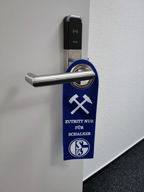 Auch im Kollegenkreis beliebt: Das Schmücken des Arbeitsplatzes. Es ist nicht unüblich, dass sich im gleichen Team AnhängerInnen beider Vereine finden, auch wenn bei Auswahlgesprächen das Thema Fußball („Und, für welchen Verein bisse?“) nicht unter den Teppich gekehrt wird. Kurz vor dem Spiel werden Wimpel, Türanhänger und andere Devotionalien auf den Tisch gepackt! Der Herzschlag wird sozusagen sichtbar gemacht.