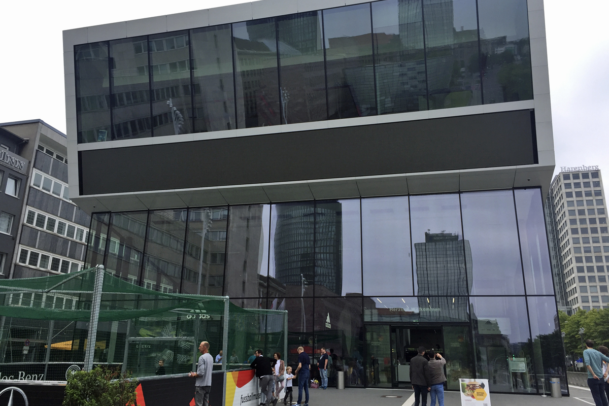 Ich war zwar schon zwei Mal im Deutschen Fußballmuseum, bin aber jedes Mal wieder beeindruckt von der imposanten, fast futuristischen Bauweise des Museums. Es ist heute nicht besonders voll und so scannen wir ohne Wartezeit unsere Tickets und fahren mit der Rolltreppe ins zweite Stockwerk. Diese Fahrt ist bereits eine gute Einstimmung, denn sie führt entlang gezeichneter Stadionszenen im Stil eines Wimmelbildes und wird untermalt von typischen Stadiongeräuschen. Die Fahrt symbolisiert den Weg ins Stadion.