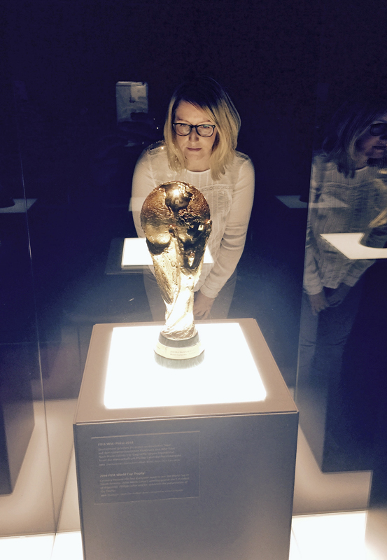 Wir schlendern aber erst mal weiter, vorbei an einem Exkurs nach England, in das Mutterland des Fußballs und jeder Menge Wissenswertem und Anschaulichem rund um die Weltmeisterschaften der letzten Dekaden. Der krönende Abschluss ist sicherlich die „Schatzkammer“, in der die verschiedenen Pokale ausgestellt sind – darunter auch WM-Siegerpokale im Original. Sehr beeindruckend, wie ich finde. Ebenfalls ein Highlight: Die 3D Animation in einem kleinen Kino, die insgesamt sieben Weltmeister wie Mats Hummels und Bastian Schweinsteiger lebensecht durch die Titelgewinne der Vergangenheit führen lässt. Bei dem Gedanken an das Finale 2014 bekomme sogar ich Gänsehaut.