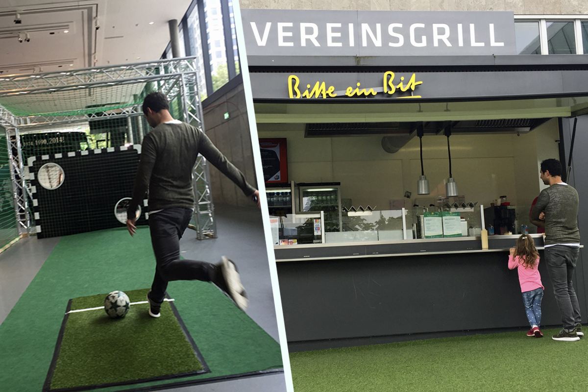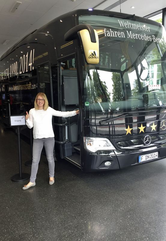 Wir nähern uns dem Ende der Ausstellung und stehen schließlich vor dem Mannschaftsbus, der die deutsche Nationalmannschaft nach ihrem Titelgewinn in Rio 2014 befördert hat. Man darf das eindeutig größte Exponat der Ausstellung sogar betreten und das Kind und wir machen es uns auf den Sitzen bequem. Wer weiß, vielleicht sogar auf dem Platz des WM-Torschützen Mario Götze? Wieder draußen, versucht der Mann sich noch mit mäßigem Erfolg im Torwandschießen, bevor wir uns wieder Richtung Ausgang bewegen. Wir holen unsere Taschen aus dem Spint, essen am „Vereinsgrill“ auf dem Vorplatz des Deutschen Fußballmuseum noch ganz stadiontypisch eine Currywurst mit Pommes und treten die Heimfahrt an.