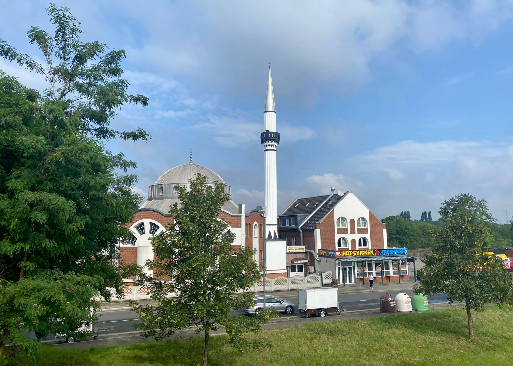 Um uns herum erstreckt sich ein Ruhrpott-Dreiklang aus Brieftaubenklinik, Moschee und Zechenkolonie. Die Taubenklinik am Sitz des Verbands Deutscher Brieftaubenzüchter e.V. widmet sich seit 50 Jahren der Gesundheit der „Rennpferde des kleinen Mannes“ und erfreut sich (zumindest in der Szene der Taubenzüchter:innen) weltweiter Bekanntheit. Auf der anderen Straßenseite erhebt sich (inzwischen auch schon seit 25 Jahren) der einzige architektonische Moscheebau in Essen, die Fatih-Moschee. Hinter dieser liegt die Arbeitersiedlung Hegemannshof, die bereits im 19. Jahrhundert als Zechenkolonie für die Zeche Zollverein erbaut wurde und deren erhaltener Teil entlang der Meerbuschstraße zu einer Zeitreise einlädt.