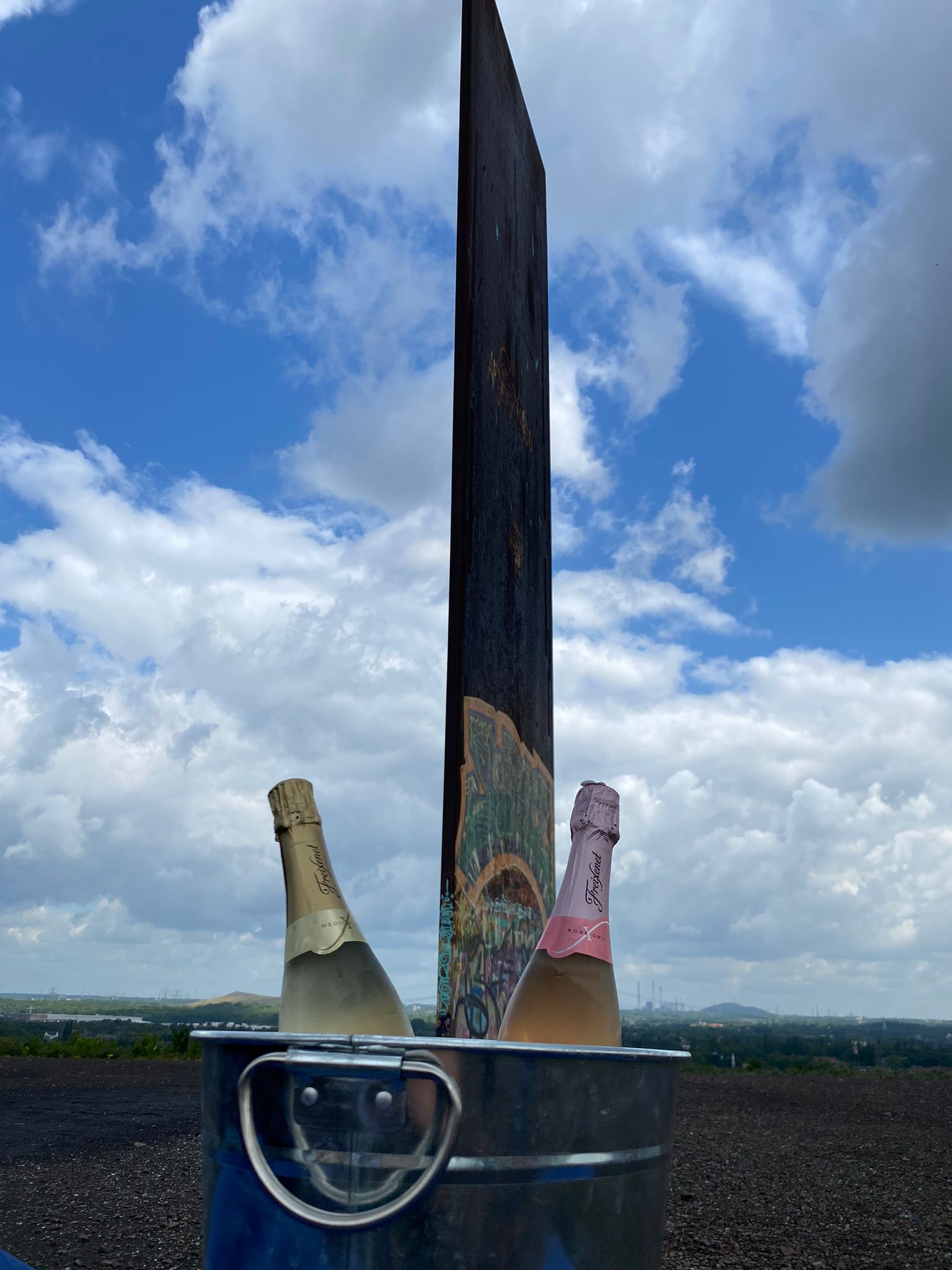 Im Kontrast zum blauen Himmel bildet sie zusammen mit der Bramme ein überragendes Fotomotiv.“ Heute erwartet uns an der Bramme zudem noch ein besonderes Schmankerl: Sektempfang! Ärgerlich nur, dass das Tischlein-Deck-Dich nicht für uns, sondern für die bereits erwähnten Betriebsausflugs-Kolleg:innen des Essener Stadtmarketings gedacht ist.