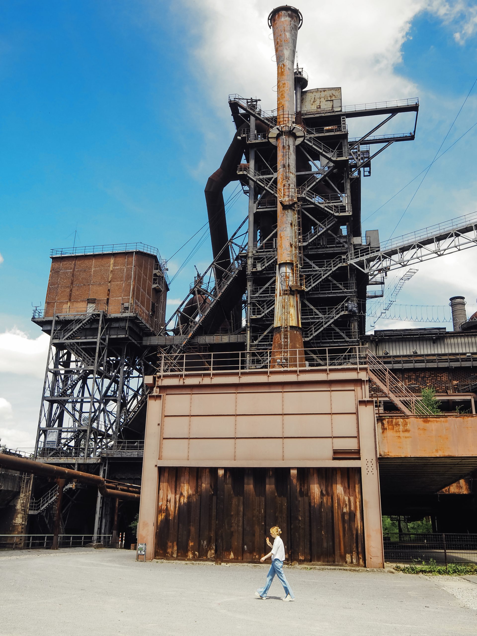 Eine Person, die ein weißes Hemd und eine blaue Jeans trägt, geht über eine offene, gepflasterte Fläche in der Nähe großer, industrieller Metallstrukturen, die von Grünflächen und Bäumen umgeben sind.
