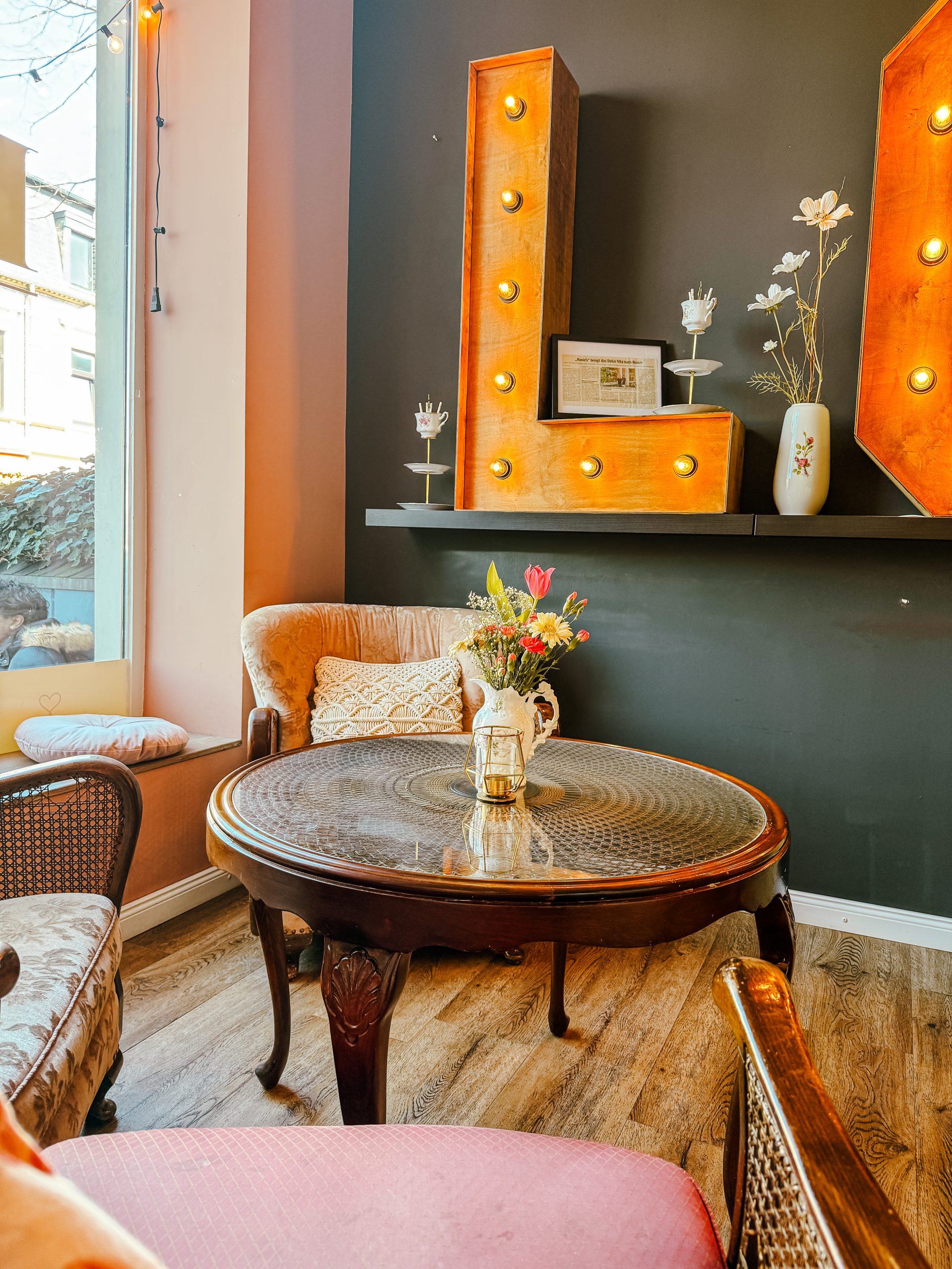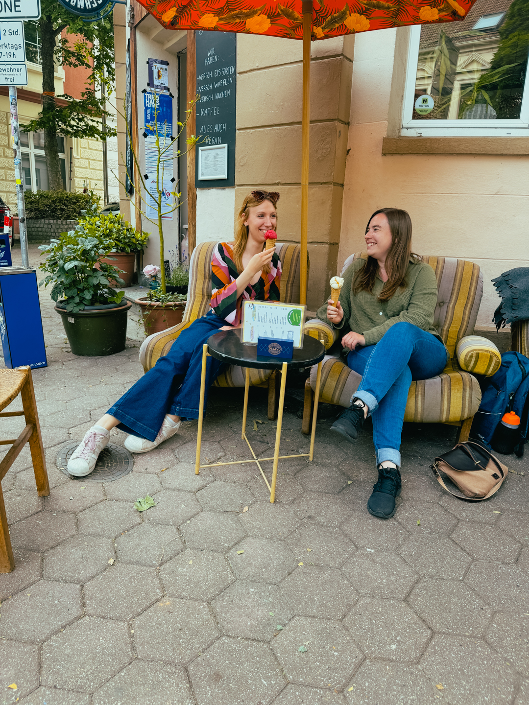 Da das Wetter aber top ist entscheiden wir uns für einen Sitzplatz draußen und die Auswahl ist richtig gemütlich. Bequeme Sessel, bunt zusammen gewürfelte Tische und Stühle und Sonnenschirmchen – der perfekte Platz um nach einem Bummel durch Dortmund zu entspannen und das Treiben der Stadt mit einem leckeren Eis zu beobachten!