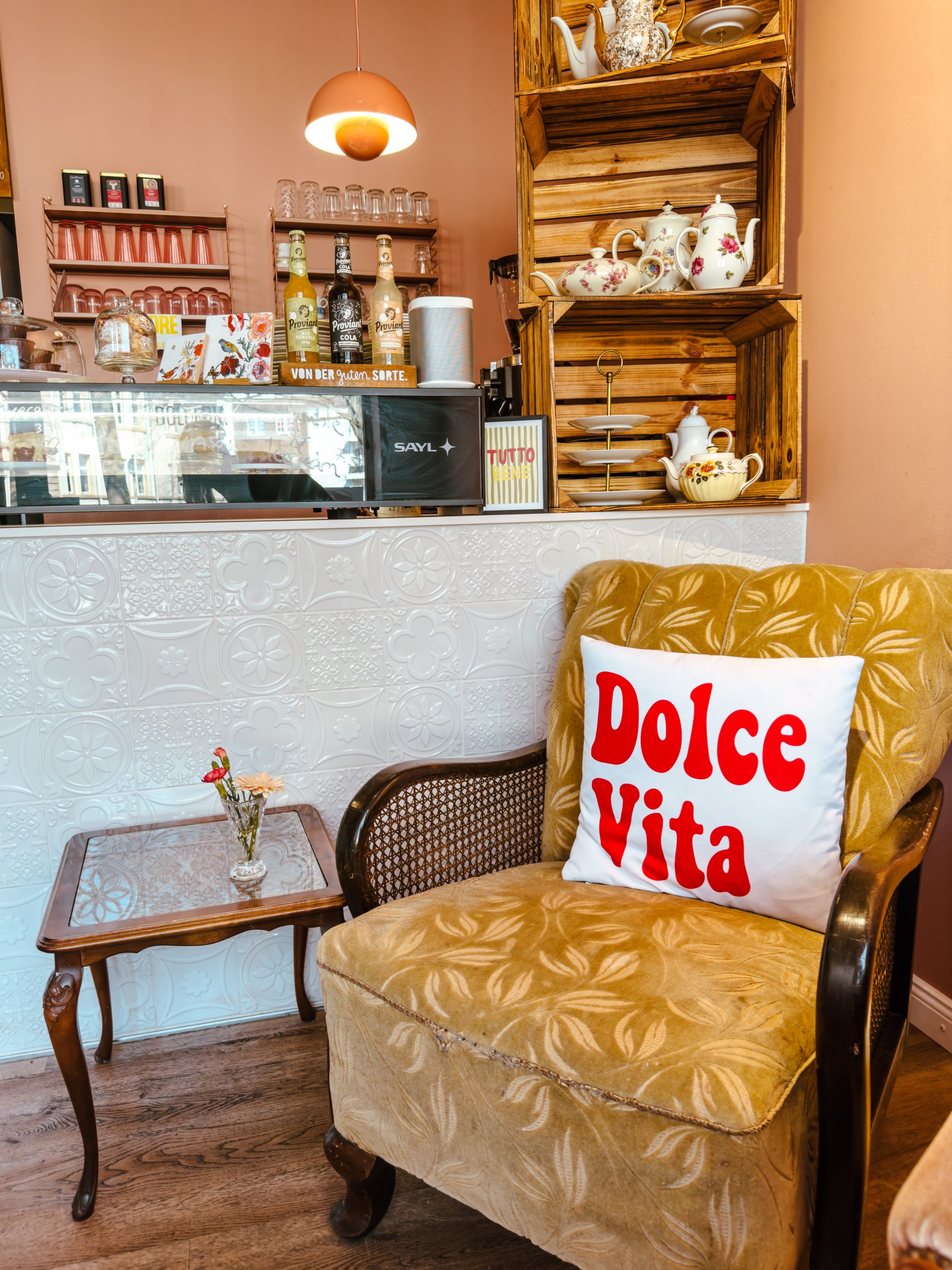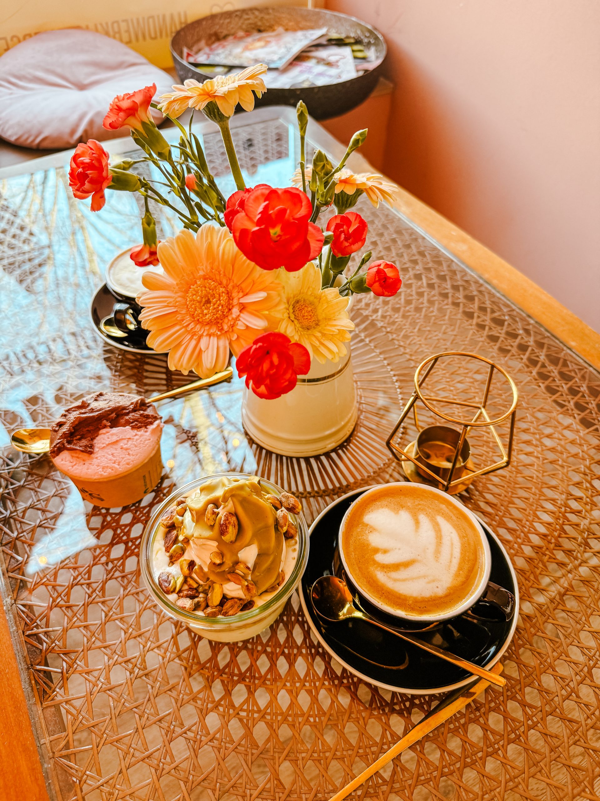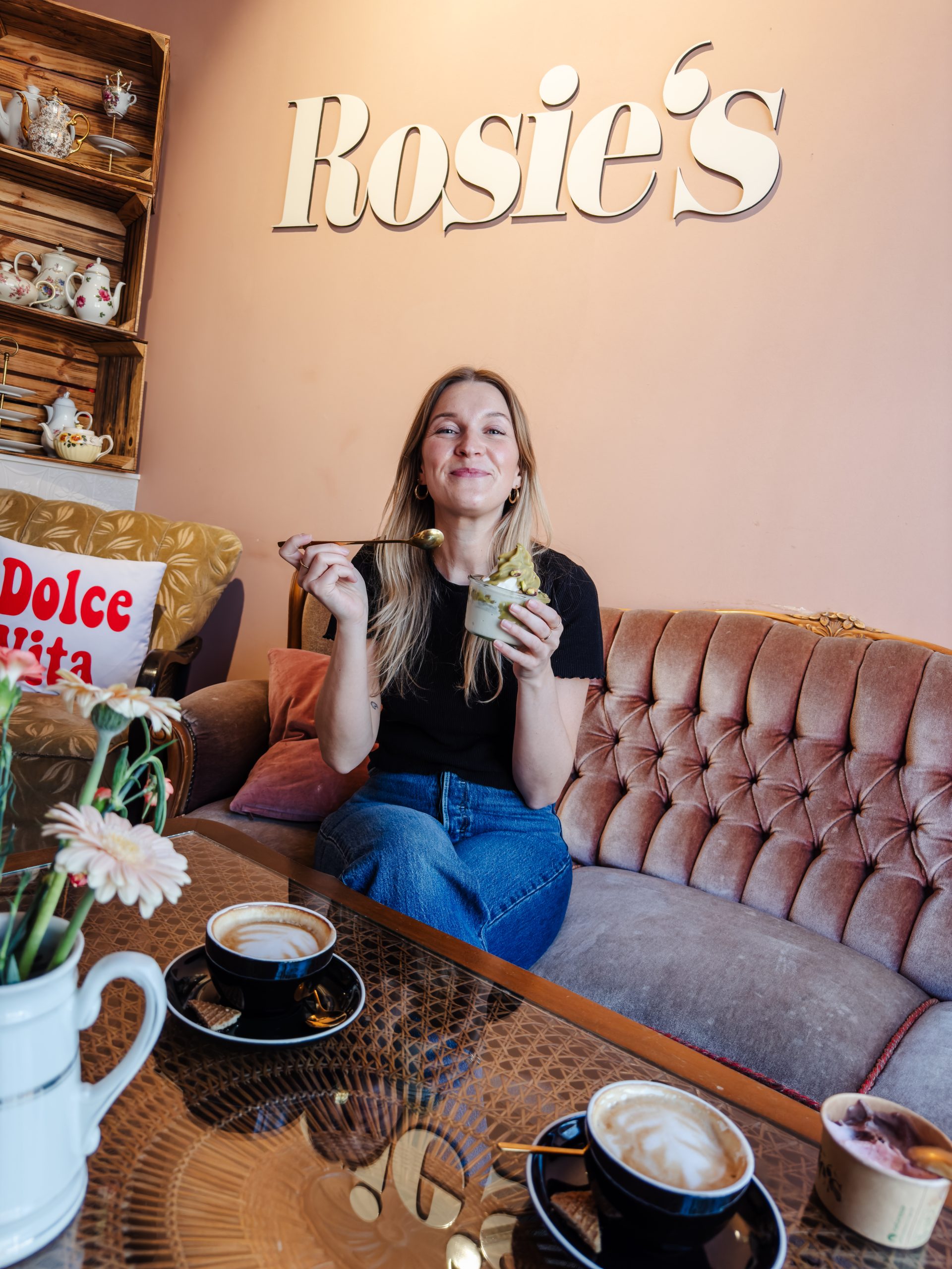 Dein Softeis kannst du dir hier als leckeren Becher bestellen: zum Beispiel für Schokiliebhaber:innen oder auch Erdbeeren und Cheesecake. Und für die ganz ausgefallenen auch mit selbstgemachtem Piztazientopping. Alles wirklich seeehr lecker. Zudem sitzt du hier ganz gemütlich und cozy in schönes Sofas und Sesseln. Und der Kaffee ist nach italienischer Standard natürlich auch 1a, la dolce vita!
