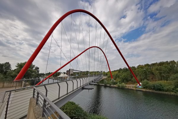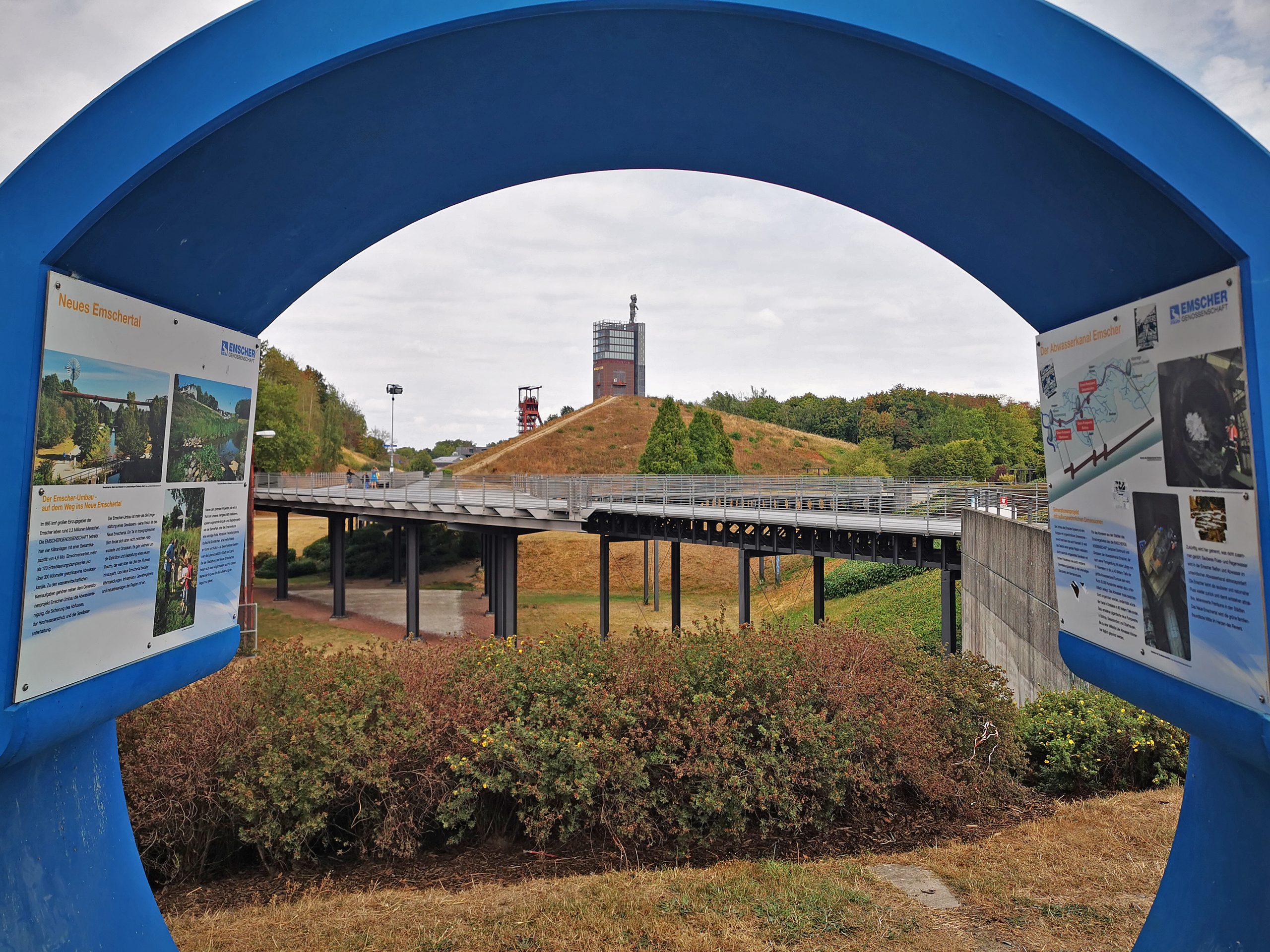 Ein kurzer Sprung über eine Autokreuzung, dann geht es auf den Emscher-Weg. Schnell ist die markante Brückenkonstruktion der Grimberger Sichel erreicht. Nach einem kurzen Stück am Kanal fahre ich wieder recht gradlinig neben der Emscher. Es ist unter der Woche und fast nichts los, sodass die Tachonadel auch mal länger im 30er Bereich sein kann.
