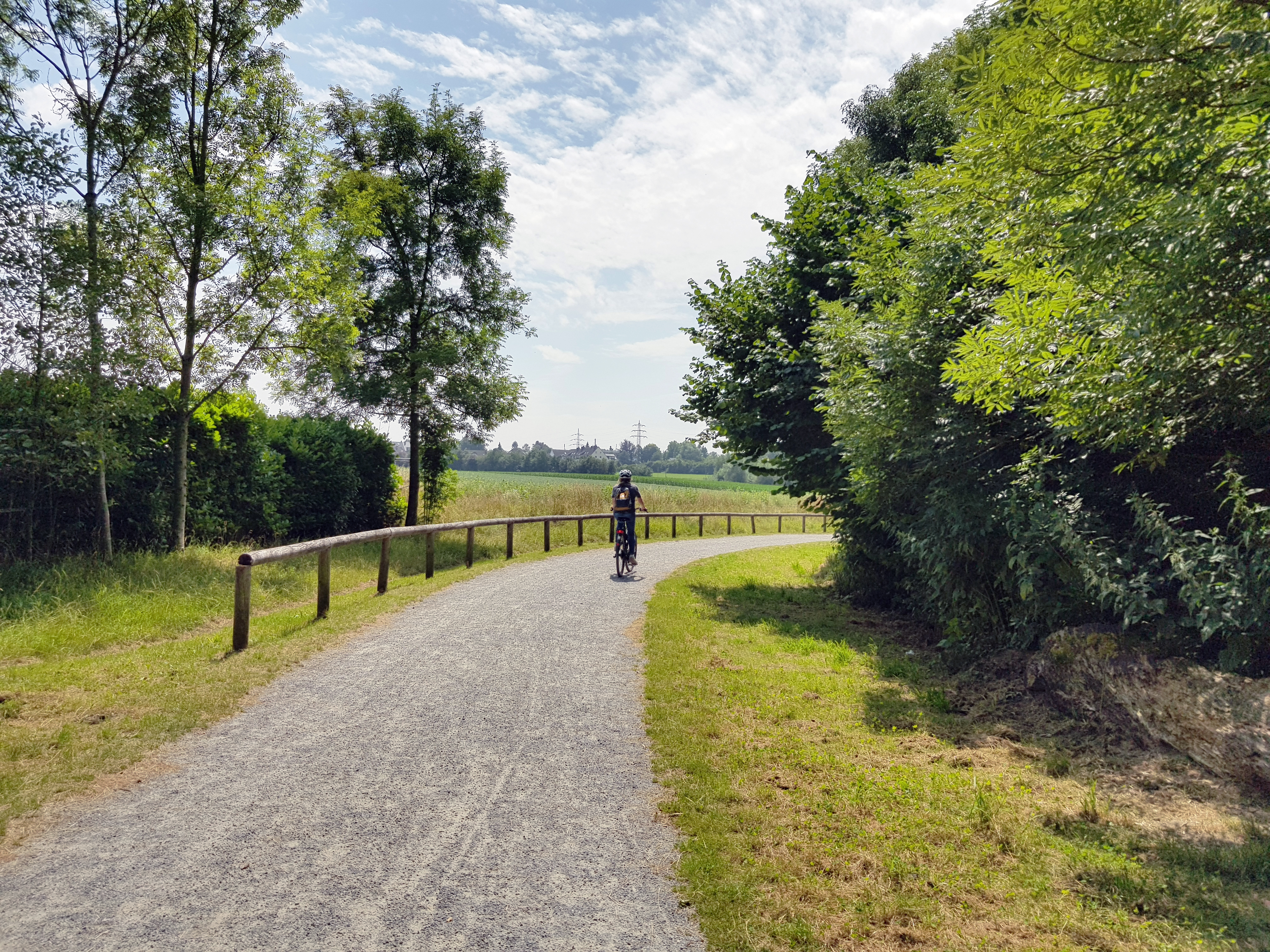 Über ausgeschilderte Radwege lässt es sich teils auf wassergebundener Decke, teils auf kleineren Straßen mit wenig Verkehr auf jeden Fall sehr entspannt weiterradeln. Nach einer kurzen Etappe vorbei an einem satten Feld geht es für uns dann schließlich auf der Rheinischen Bahn, besser bekannt als RS1, weiter. Die ehemalige Bahntrasse wird immer weiter zum Radschnellweg Ruhr ausgebaut, der ein Paradebeispiel für entspanntes Radfahren abseits des Straßenverkehrs ist – und v.a. nach seiner Fertigstellung sein wird!