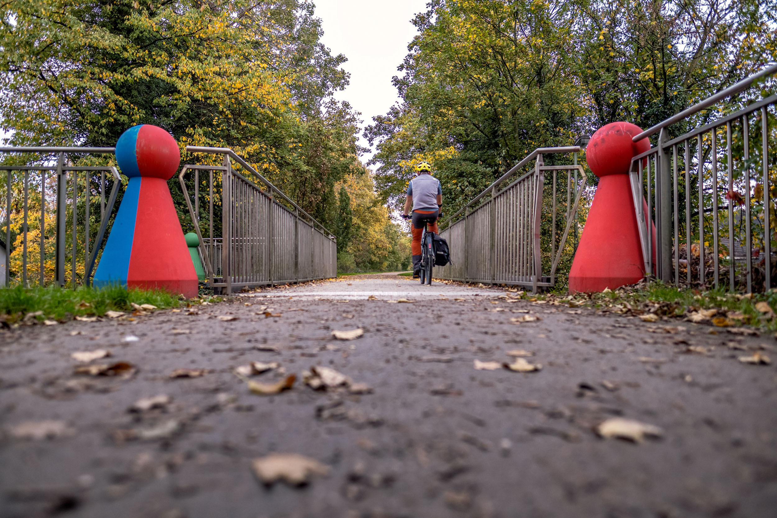 Uns zieht es wie gesagt schnell weiter auf die HOAG-Trasse, die uns als gut ausgebauter Bahntrassenradweg schnell zurück nach Oberhausen bringen wird. Die vielen Brücken sind gesäumt von etwas zu groß geratenen Mensch-Ärger-Dich-Nicht Spielfiguren, die in bunten Farben bestens ins Herbstbild passen.