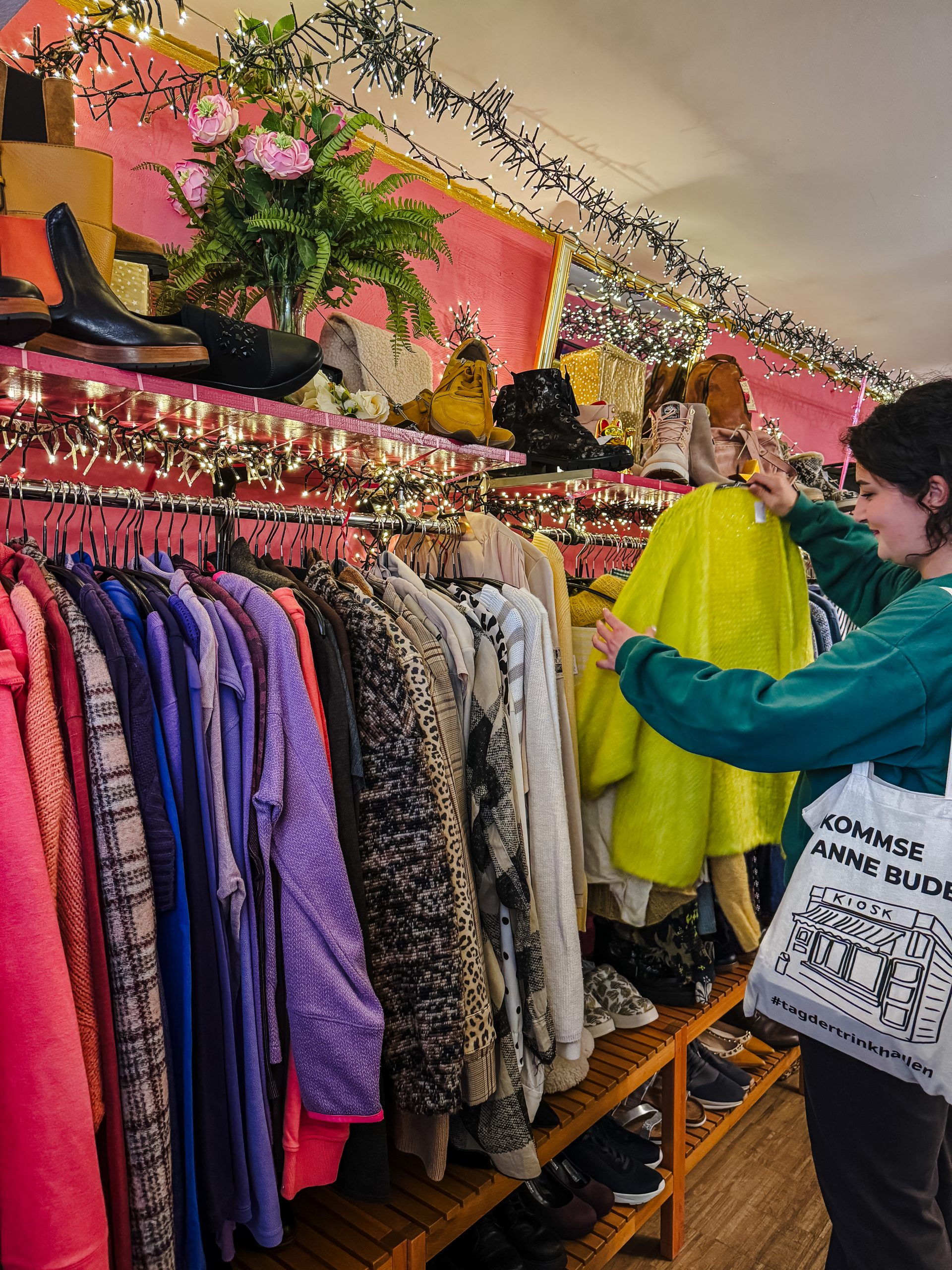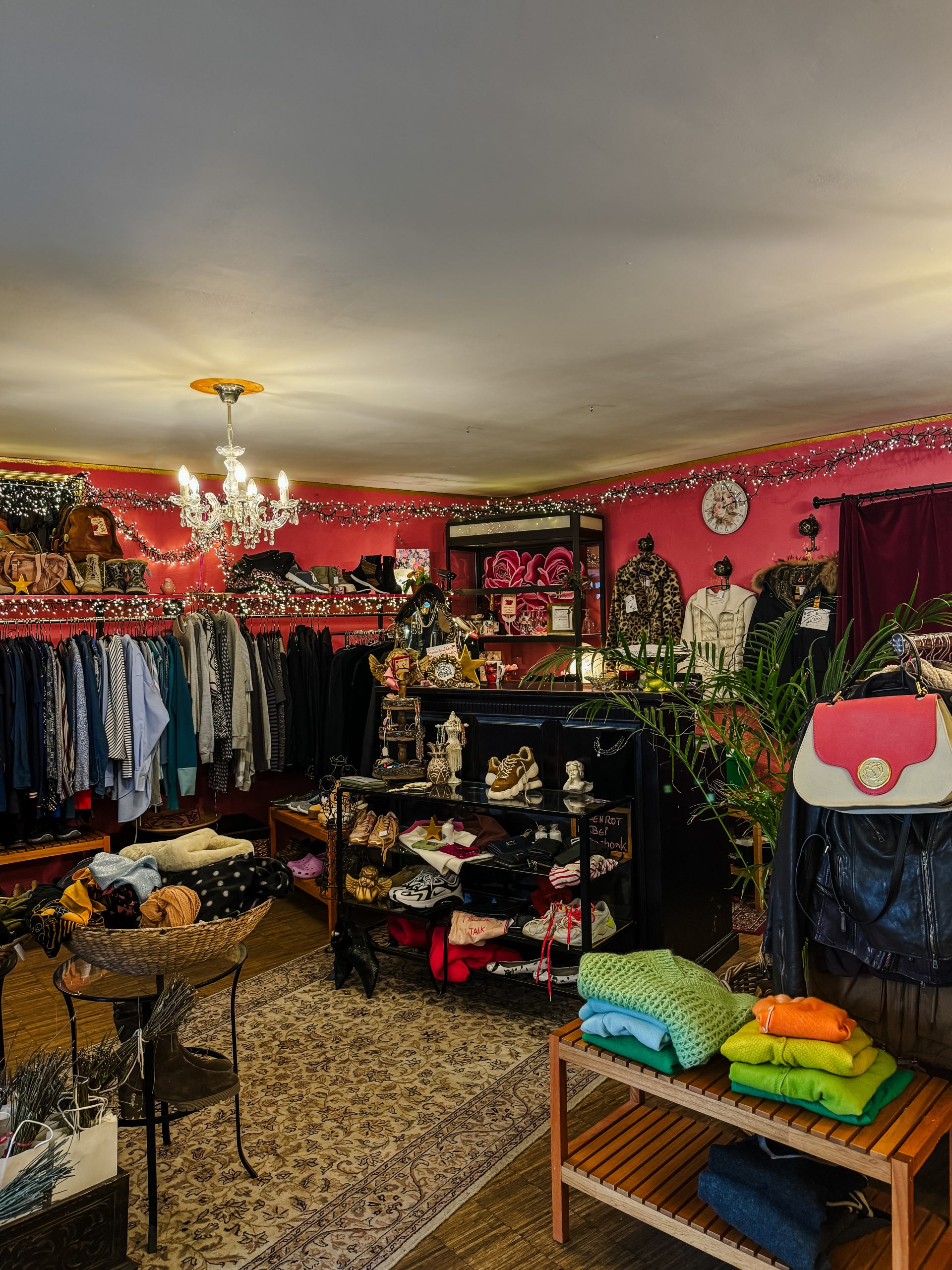 Nur einen Steinwurf entfernt und quasi direkt „umme Ecke“ von Misfits & Stoff-Wechsel liegt das Rosenrot. Schon beim Reinkommen schlägt mein Herz höher: Das gesamte Geschäft hängt voller Lichterketten und ist einfach nur gemütlich. Das Konzept ist ein anderes als in den Läden, in denen ich bisher war: Die Kleidung, die es hier zu kaufen gibt, ist modern und maximal zwei Jahre alt. Preislich auch absolutes Mittelfeld und schont sicher mehr deinen Geldbeutel als Mode neu zu kaufen.