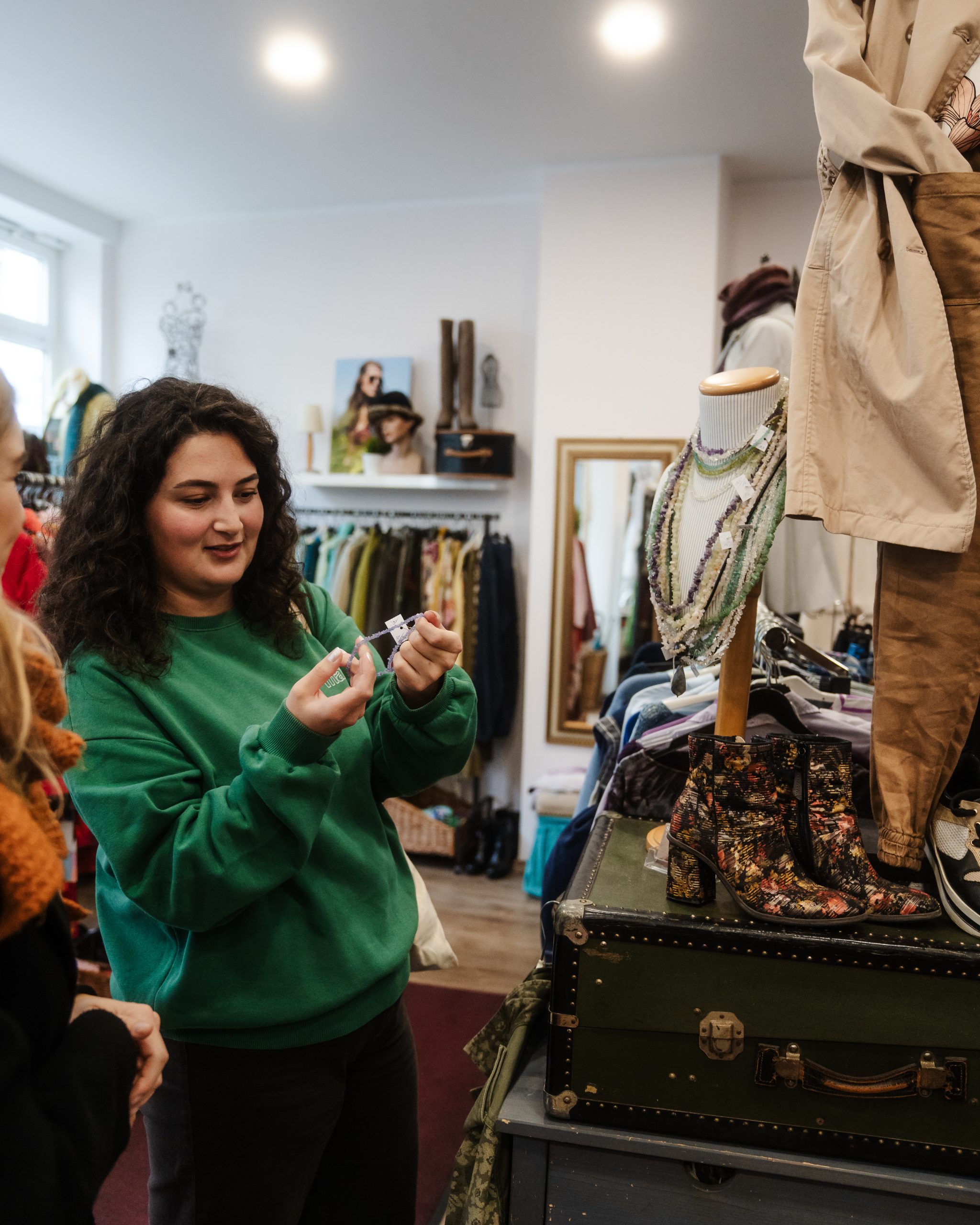 Bei Feel again gibt es vor allem Damenmode – aber auch eine Vintage-Ecke mit unisex Teilen wie z. B. Track Jacken. Dich erwarten hier etwa femine Leinenblusen aber auch cozy Strickpullover. Und das in fast allen größen von XS bis teilweise 3 XL. Besonders finde ich hier die Auswahl an Handtaschen und Schuhen. Es gibt z. B. ausgefallene Cowboy-Boots oder auch Schuhe mit Schlangenlederoptik. Zudem gibt es noch eine Theke mit schönem Schmuck und eine Ecke mit Wollschals aus London. Man merkt wie viel Liebe in die Inneneinrichtung und die Auswahl der Kleidung gesteckt wurde und fühlt sich gar nicht wie in einem Second Hand Store, sondern eher wie in einer besonderen Boutique. Ideal gegen Winterblues ist auf jeden Fall der tropische Vibe, da wird dir direkt wieder warm.