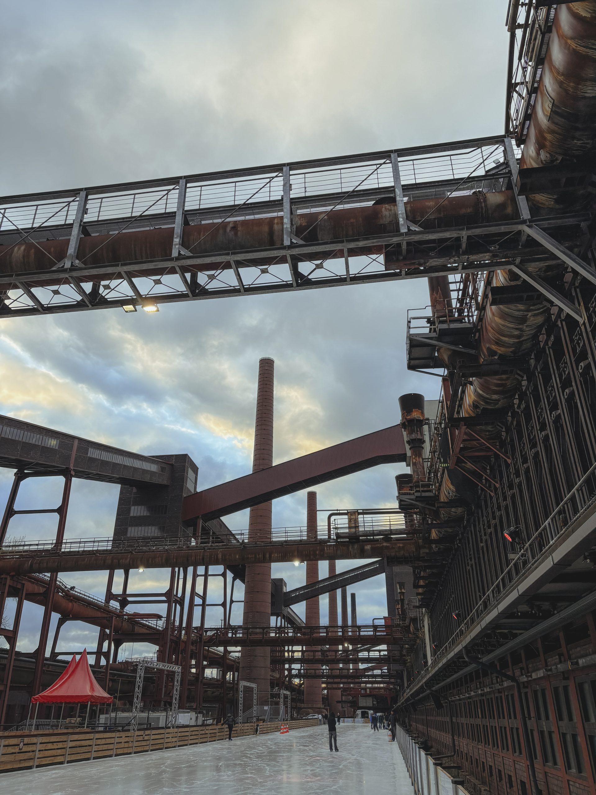 Zuerst möchte ich dich zu einer der schönsten Eisbahnen im Ruhrgebiet mitnehmen: Die Eisbahn auf dem UNESCO-Welterbe Zollverein in Essen. Diese Eisbahn ist etwas ganz Besonderes, denn sie befindet sich auf einem ehemaligen Bergbaugelände. Wo bis vor einigen Jahren noch hart gearbeitet, oder wie wir im Pott sagen würden, „malocht“ wurde, kannst du jetzt also bis zum 5. Januar 2025 eine spaßige Schlitterpartie genießen. Die Schlittschuhe kannst du super einfach vor Ort ausleihen. Abends verwandelt sich die Bahn in eine bunte Eisdisco, aber auch tagsüber hat es seinen Charme.