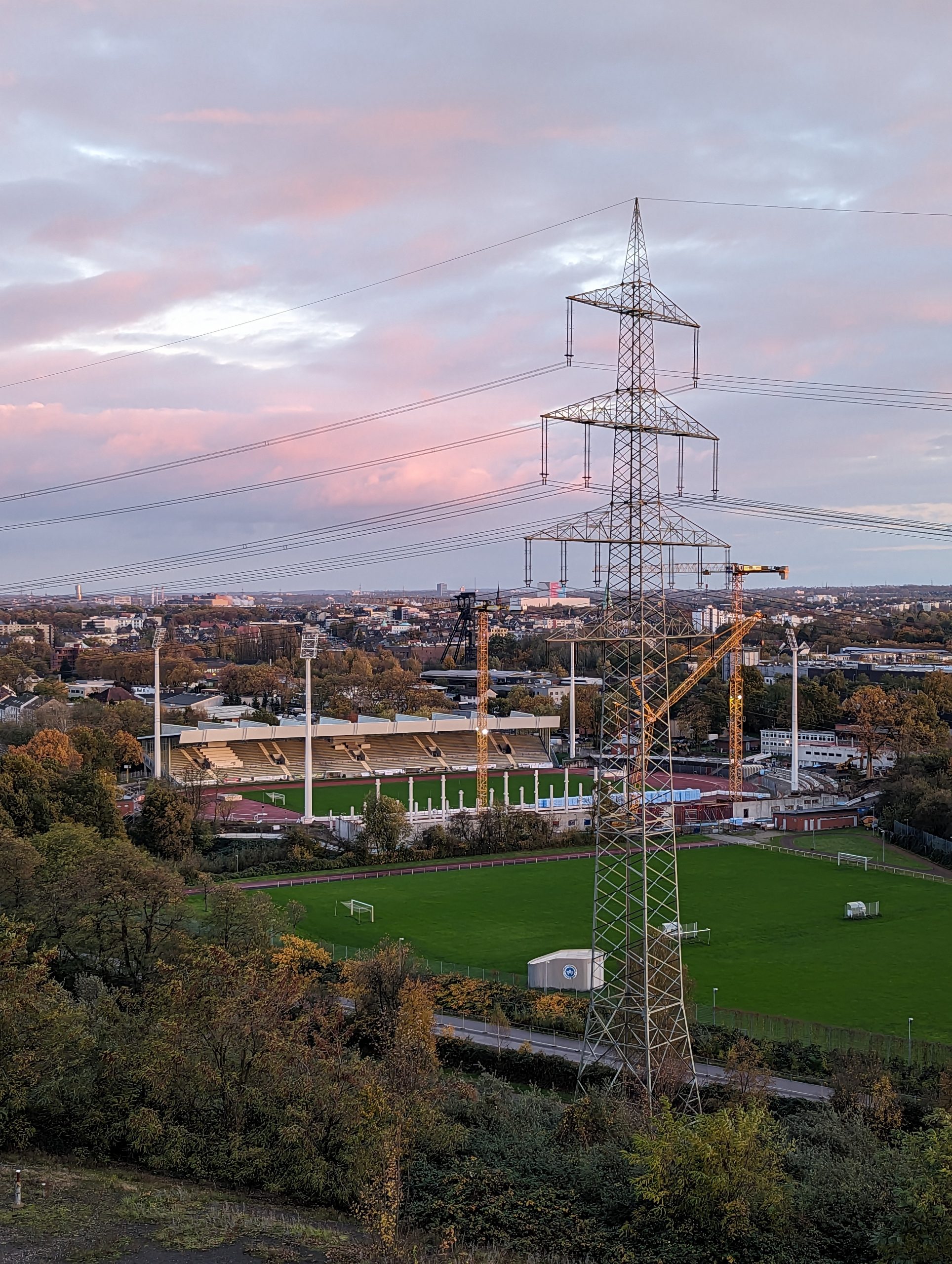 Ich könnte in Gelsenkirchen bleiben und den Nordsternturm besuchen.* Obwohl das Fürstenbergstadion des früheren Oberligisten STV Horst Emscher nur fünf Autominuten vom Nordsternturm entfernt liegt, ist es von der 83 Meter hohen Aussichtsplattform nicht zu sehen – die VELTINS-Arena dagegen schon. Sie befindet sich in vier Kilometer Entfernung und wer sie von hier oben fotografieren möchte, bekommt den Industriecharme gratis dazu.