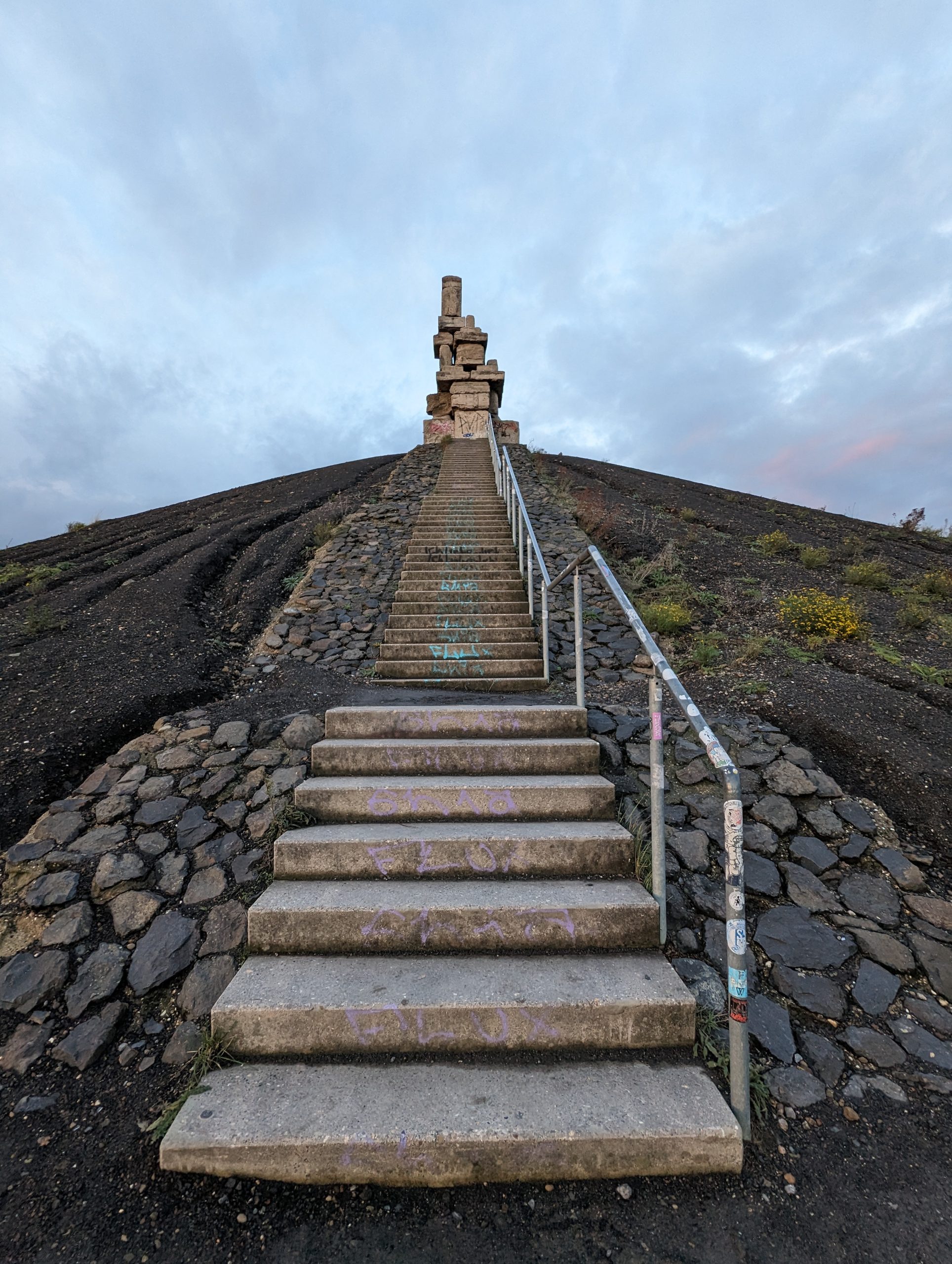 Bevor ich zurück ins „Moxy“ fahre, mache ich noch einen Abstecher in den Bochumer Stadtteil Wattenscheid. Die Halde Rheinelbe gehört offiziell zu Gelsenkirchen-Ückendorf, liegt aber zentral zwischen Gelsenkirchen und Wattenscheid. Ich parke in der Leithestraße und brauche irgendwas zwischen fünf und zehn Minuten, bis ich das Ruhrgebiets-Stonehenge erreicht habe.